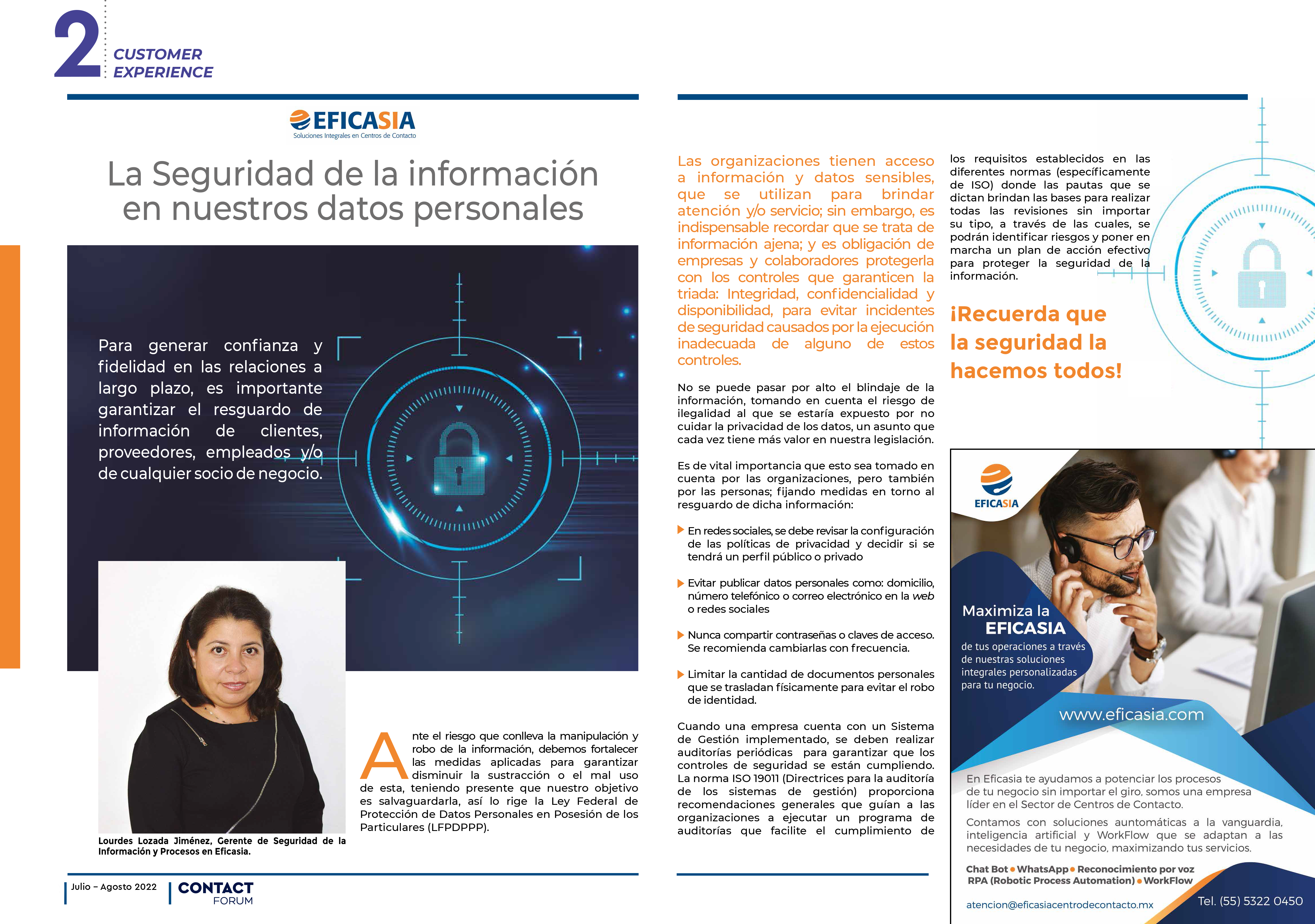 Lourdes Lozada, Gerente de Seguridad de la Información Eficasia, explica para la publicación más reciente del IMT la importancia de garantizar la seguridad de los datos de clientes, usuarios y colaboradoras/es, de acuerdo a los lineamientos oficiales y leyes vigentes en seguridad de la información.